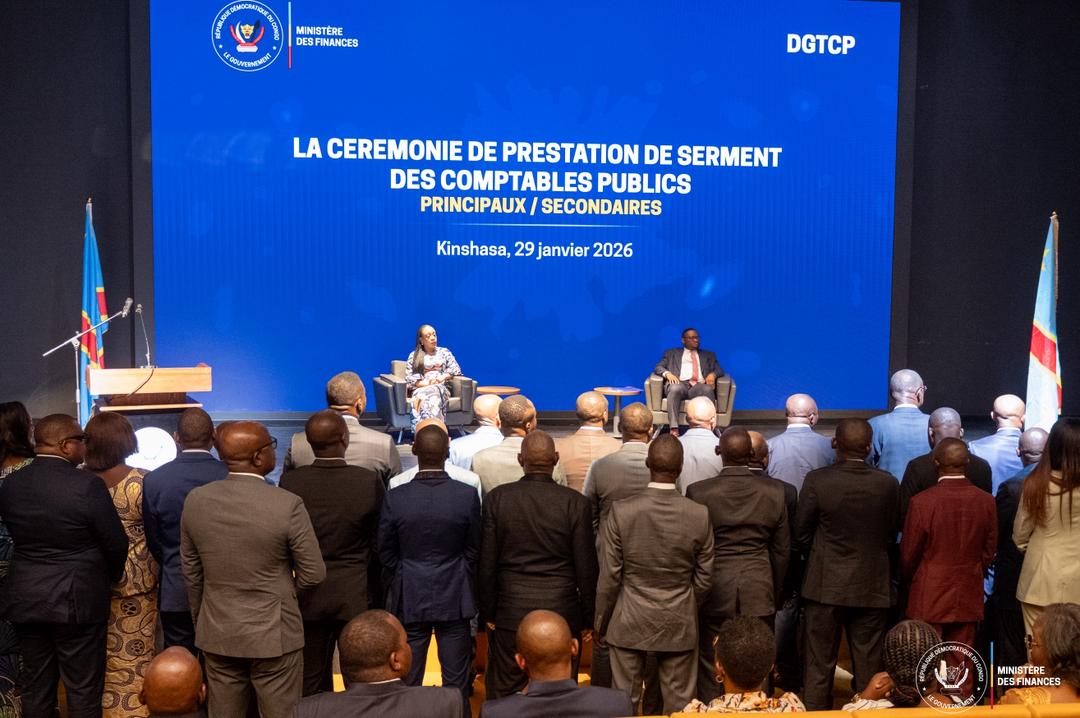 La salle P1 Budget du Centre financier de Kinshasa a servi de cadre, le jeudi 29 janvier 2026, à la cérémonie solennelle de prestation de serment des comptables publics principaux et les Comptables secondaires des postes comptables des ministères pilotes dédiés à la déconcentration de l’Ordonnancement en conformité avec les engagements conclus entre le Gouvernement de la République et le Fonds Monétaire International dans le cadre du programme de la Facilité élargie de Crédit Présidée par Son Excellence Monsieur le Ministre des Finances, Doudou Fwamba Likunde Li-Botayi @LikundeR Sous l’égide de la Direction Générale du Trésor et de la Comptabilité Publique (DGTCP), cette activité s’inscrit dans la dynamique de la transition vers une comptabilité d’exercice fondée sur les droits constatés. Cette réforme majeure marque une rupture avec les anciennes pratiques, en érigeant la transparence, la redevabilité et la performance au rang des piliers de l’action publique. Elle vise notamment la certification des comptes de l’État selon les standards internationaux, renforçant ainsi la crédibilité financière du pays et son attractivité auprès des investisseurs et des bailleurs de fonds. En offrant une meilleure visibilité sur le patrimoine de l’État et des données financières consolidées, ces chantiers stratégiques positionnent la République Démocratique du Congo parmi les économies modernes capables de transformer l’information financière en un véritable outil de pilotage, d’aide à la décision et de gouvernance. Dans son allocution, Monsieur le Directeur Général a.i de la DGTCP, MAABE MUANYIMI Serge @SergeMaabe3 , a souligné que l’acte posé ce jour ne relève ni d’un simple symbole ni d’une formalité protocolaire, mais constitue un acte juridique fondamental conditionnant l’exercice effectif de la fonction de comptable public. Selon lui, cette prestation de serment de ces acteurs clés dans l’exécution du budget de l’Etat marque un jalon décisif dans l’organisation comptable de l’État, particulièrement dans le cadre de l’opérationnalisation de la réforme de la comptabilité et gestion de la trésorerie. « Le serment prêté devant Son Excellence Monsieur le Ministre des Finances constitue un engagement solennel pris devant l’État et la Nation. Il impose aux comptables publics des obligations essentielles, notamment l’indépendance, l’intégrité, l’interdiction de toute falsification des comptes, le refus de toute complaisance face aux irrégularités et le respect strict du secret professionnel », a-t-il poursuivi. Il a également rappelé que toute violation de ces obligations engage la responsabilité personnelle des comptables concernés, tant devant le juge des comptes que devant l’autorité administrative, et le cas échéant, devant les juridictions pénales. À travers cette cérémonie, le Gouvernement réaffirme sa volonté d’assainir la gestion des finances publiques et de bâtir une administration financière moderne, crédible et performante, au service du développement national. CELLULE DE COMMUNICATION.